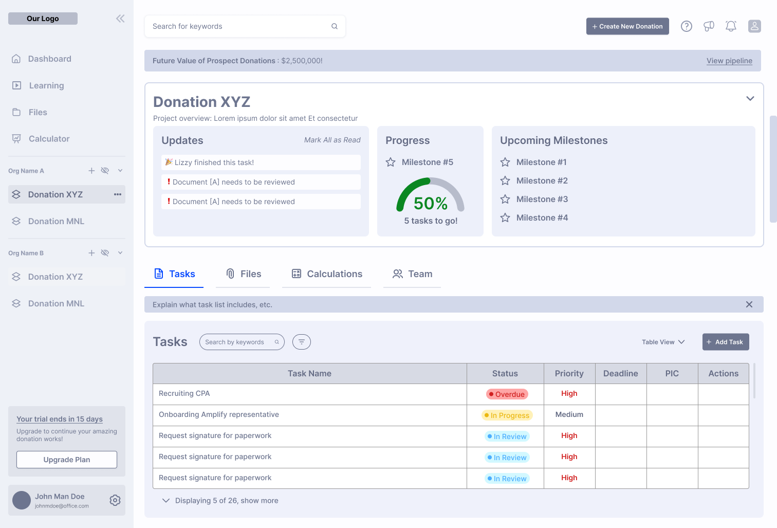 Clear callouts for when to invite others (e.g. donor, team, board members)